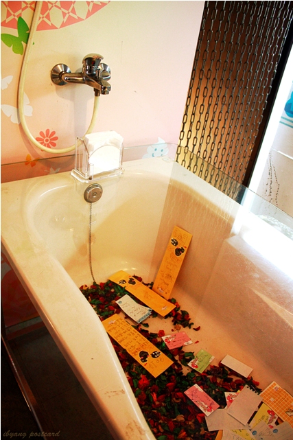 Heeeey! Another one from the very well-recognized toilet from all the toilets in the world! One table is bathroom tub and a shower on the wall. And there are even dried rose petals and letters in it.